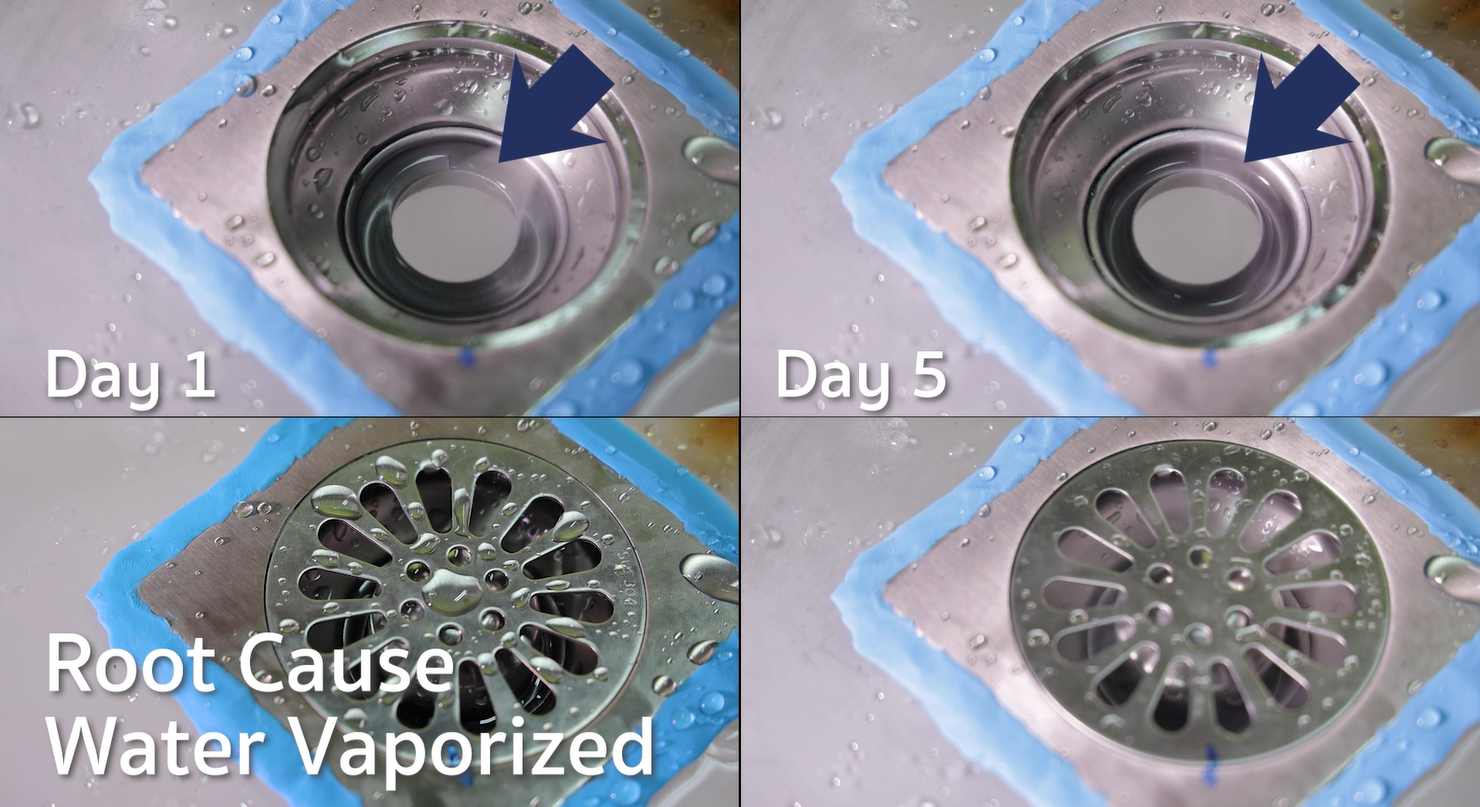 ซึ่งจุดบกพร้องของปัญหาเรื่องกลิ่นเหม็นย้อนเข้ามาในห้องน้ำ เนื่องจากน้ำระเหยเนื่องจากมีปริมาณน้ำน้อยที่สุดนั่นก็คือ Floor drain เพียงไม่ได้ใช้งานแค่ 2-4 วันก็สามารถทำให้น้ำระเหยลดระดับลงจนผลิตภัณฑ์ไม่สามารถกันกลิ่นได้