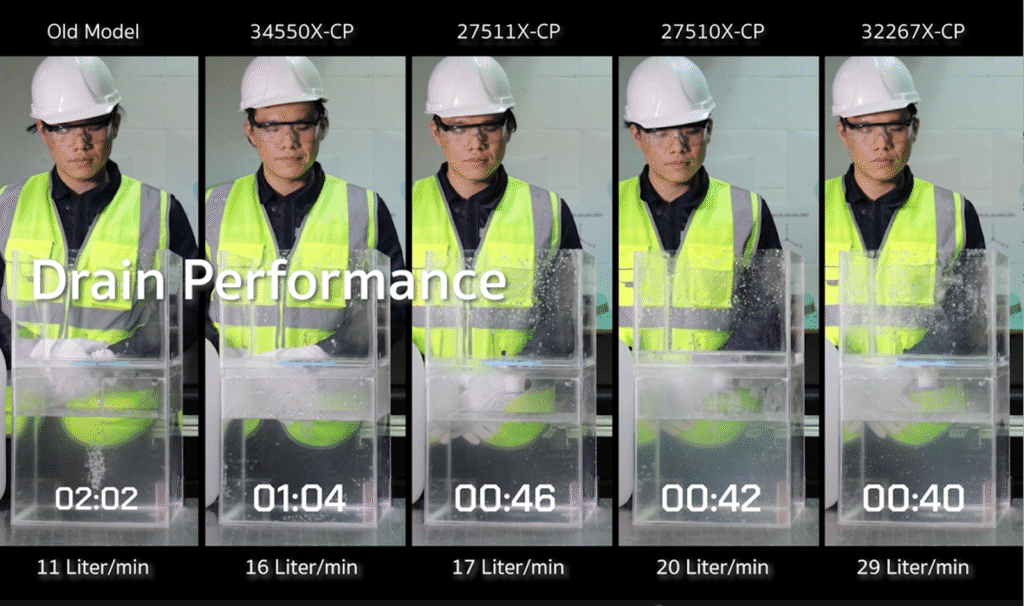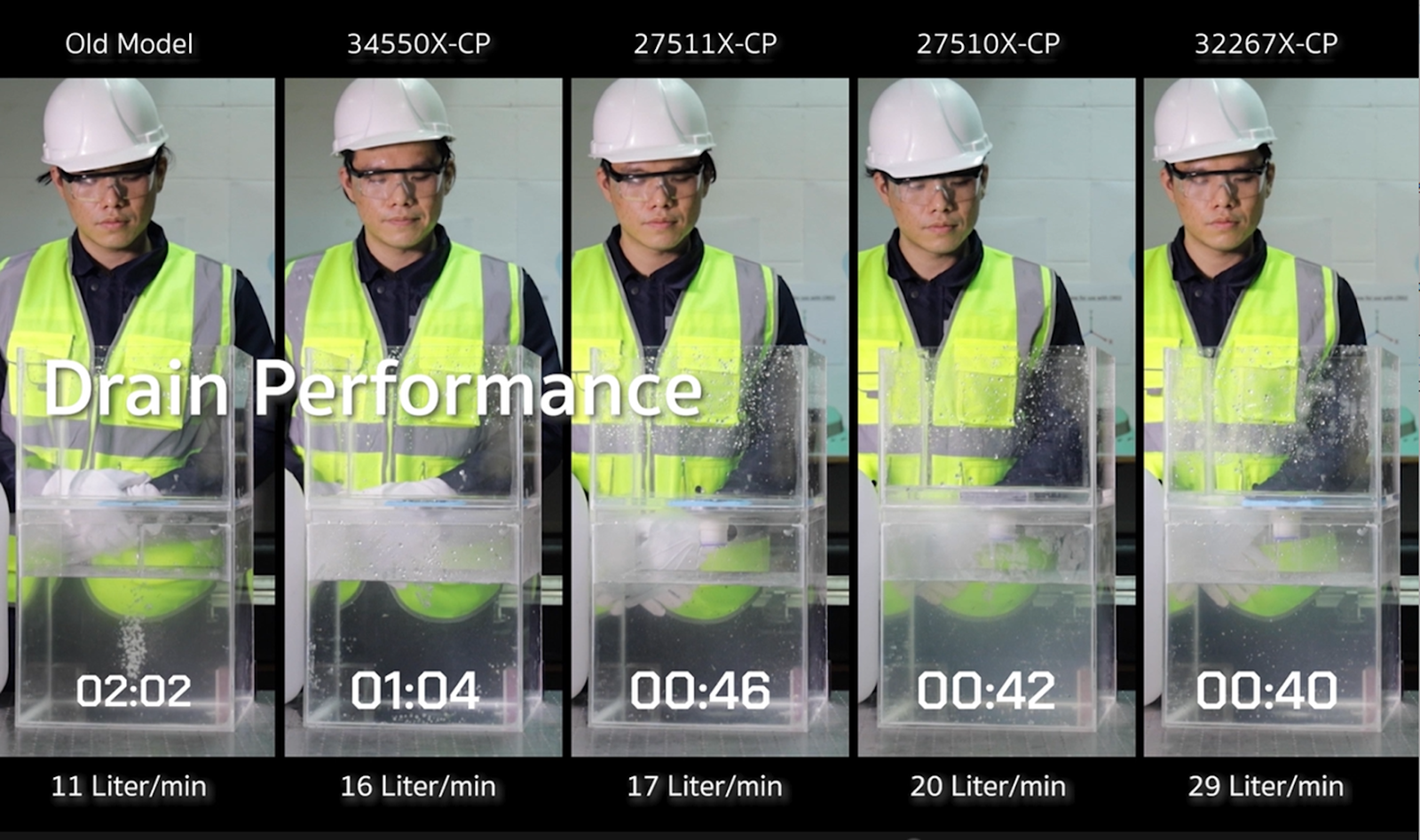 อ้างอิงจากการทดลองเรื่อง Flow rate การระบายน้ำ จะเห็นได้ว่า Old model ระบายน้ำ 1 แกลลอนใช้เวลาถึง 2 นาที ซึ่งเป็นอัตราค่าเฉลี่ยของรูปแบบทั่วไป(โดยประมาณ 12-15 ลิตร/นาที) และในส่วน ซีรีย์ High Performance ก็สามารถทำงานได้ดีกว่า