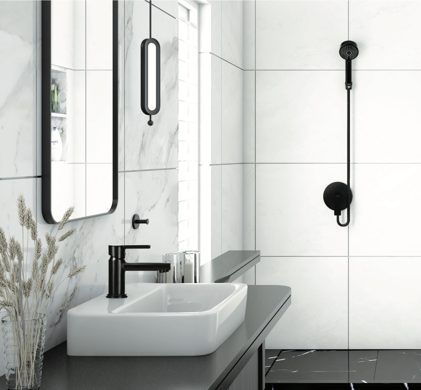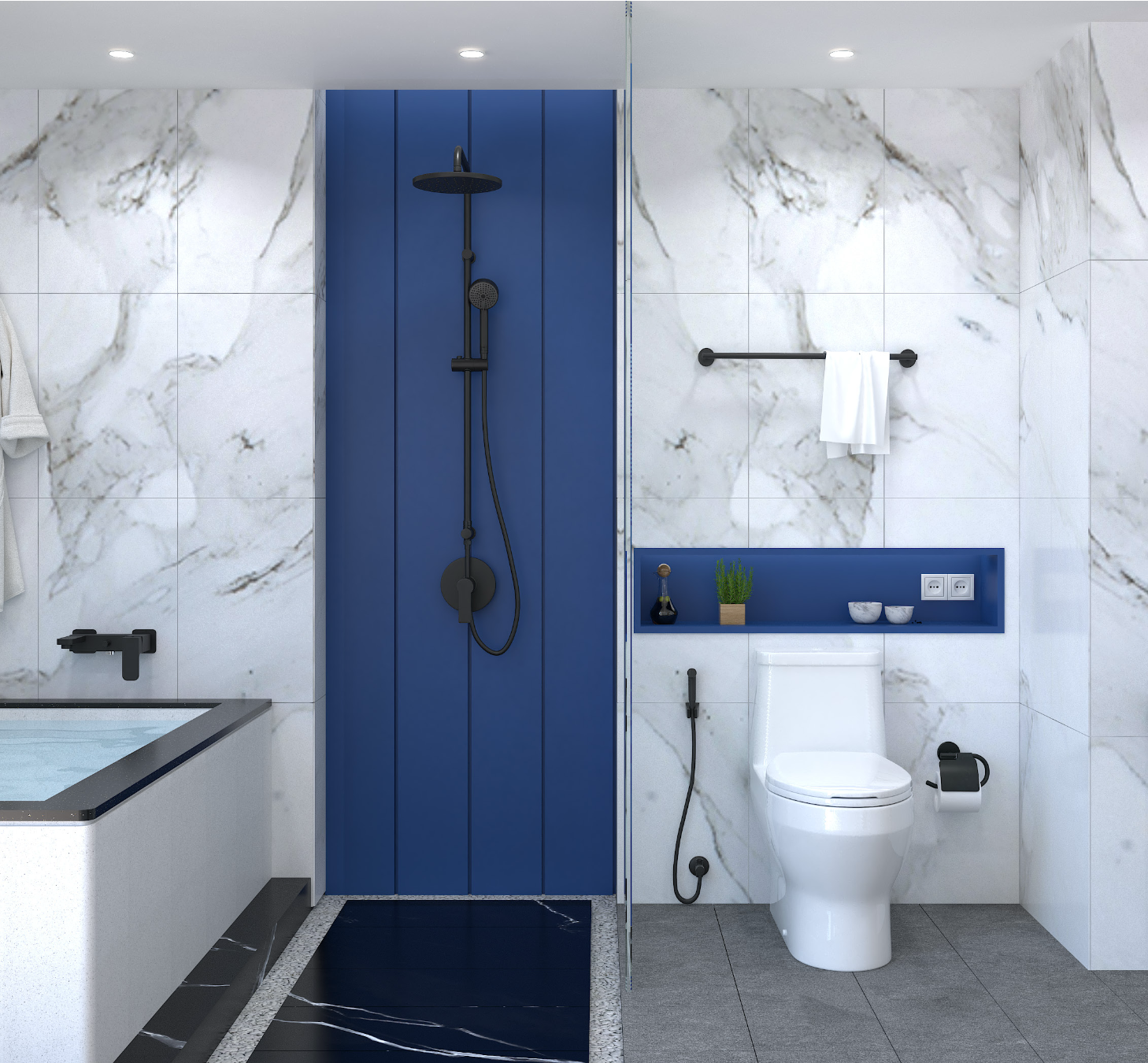 - การจัดวาง: เน้นฟังก์ชันพื้นฐาน ใช้วาล์วฝักบัว (แบบฝังหรือลอย) คู่กับ “ฝักบัวสายอ่อนและราวเลื่อน (Slide Bar)” เพื่อปรับระดับความสูงได้ หรือหากต้องการความคลีนจะใช้แค่ขอแขวนฝักบัวก็ได้ เน้นความโปร่งและประหยัดพื้นที่
