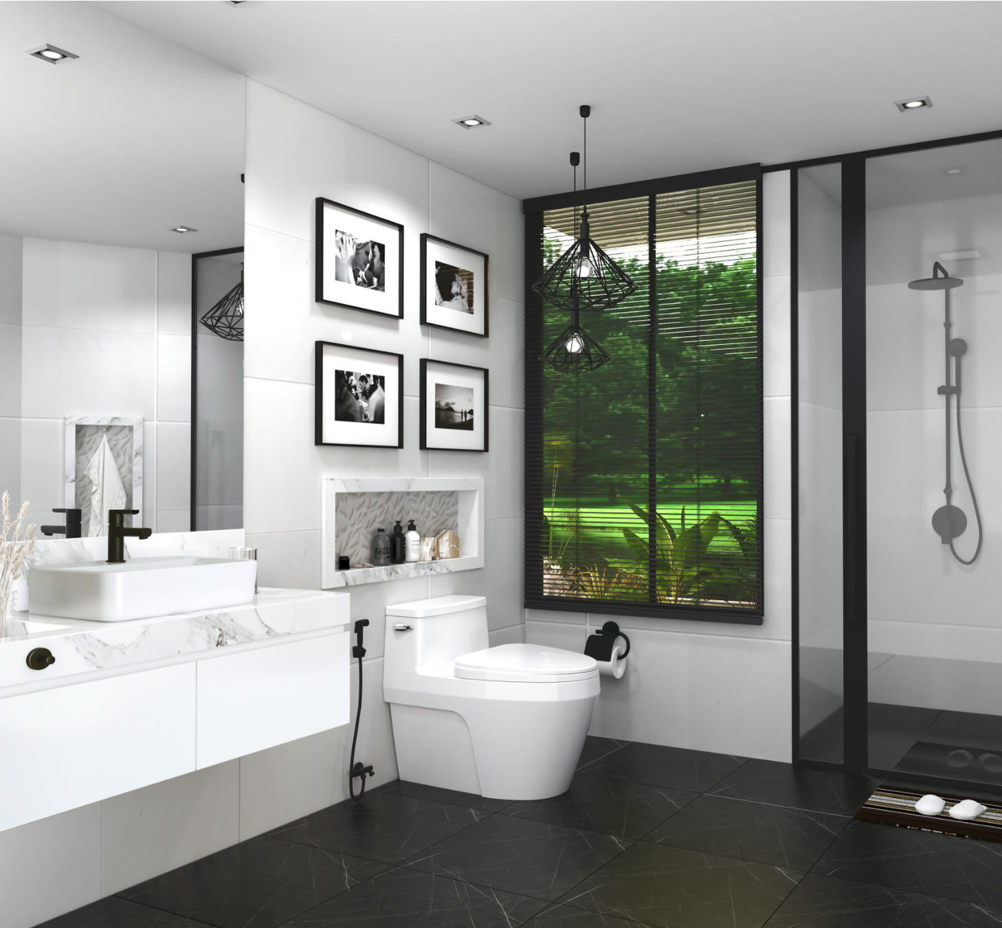 - สุขภัณฑ์แบบแขวนผนัง (Wall-Hung): ที่สุดของความมินิมอลและหรูหรา ตัวโถลอยจากพื้น ทำความสะอาดพื้นง่ายมาก แต่การติดตั้งซับซ้อนกว่าเนื่องจากต้องเตรียมให้เหมาะสมกับการติดตั้งขายึด