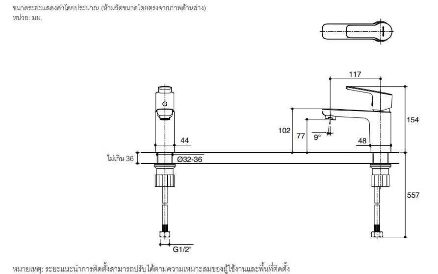 • ระยะจากกึ่งกลางตัวก๊อกถึงกลางปากก๊อก 117 มม.